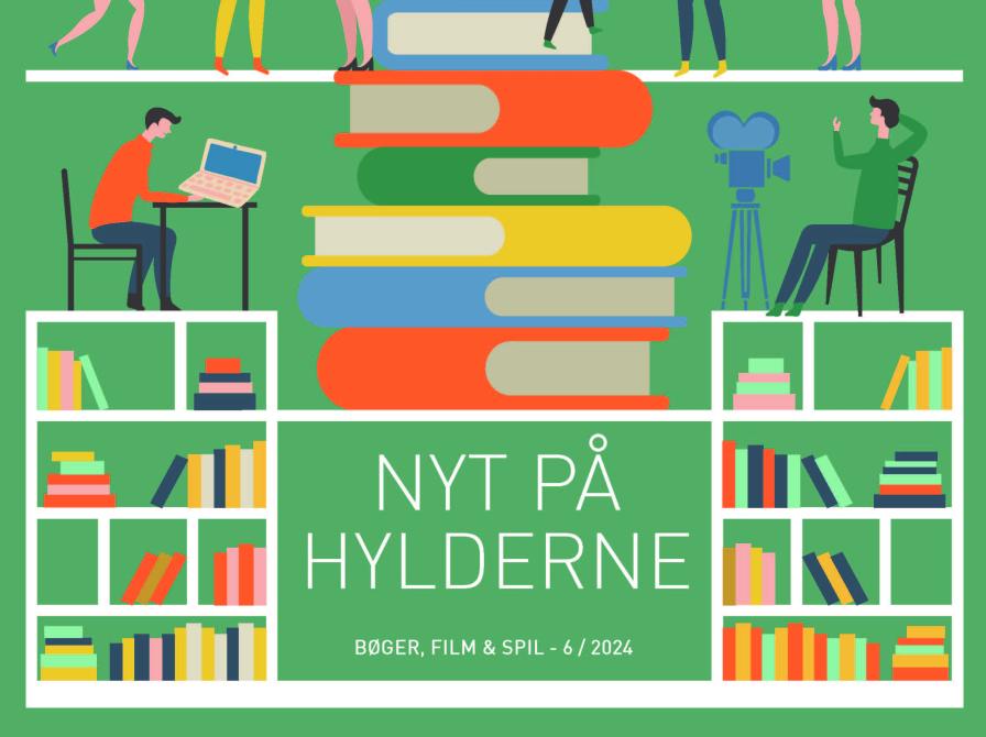Nye bøger, film og spil - 6/2024. Folder med blandet nyt på hylderne. Titler på både nye bøger, film og spil.